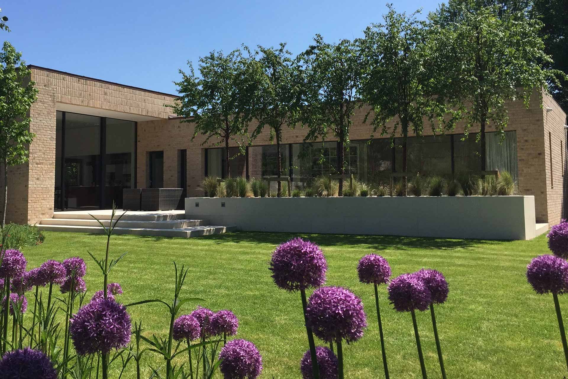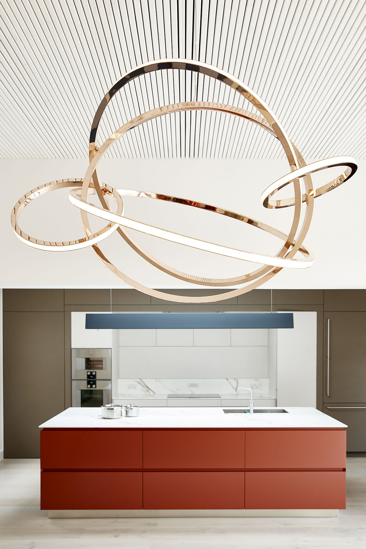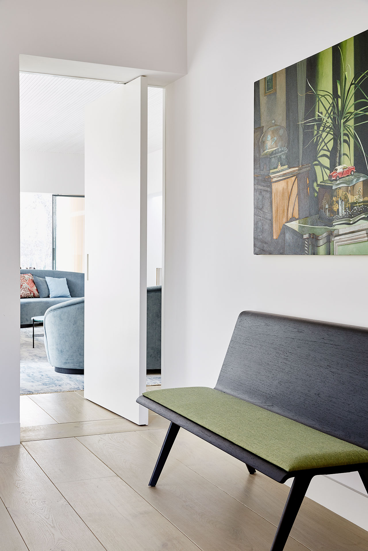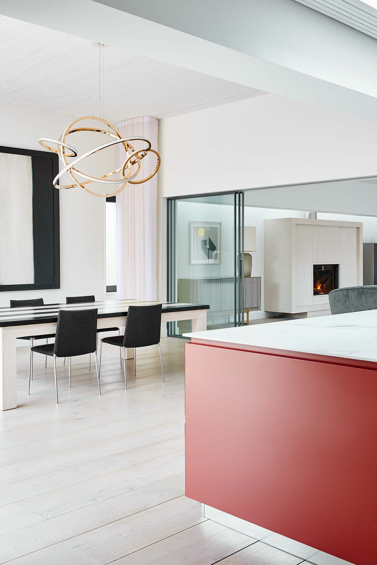 This project is a new build house. The ground floor was conceived as an open plan luxury apartment with additional bedrooms and bathrooms on the first floor. A series of rooms open from the hallway but are not immediately visible. This allows for a level of privacy and creates a sense of formality.