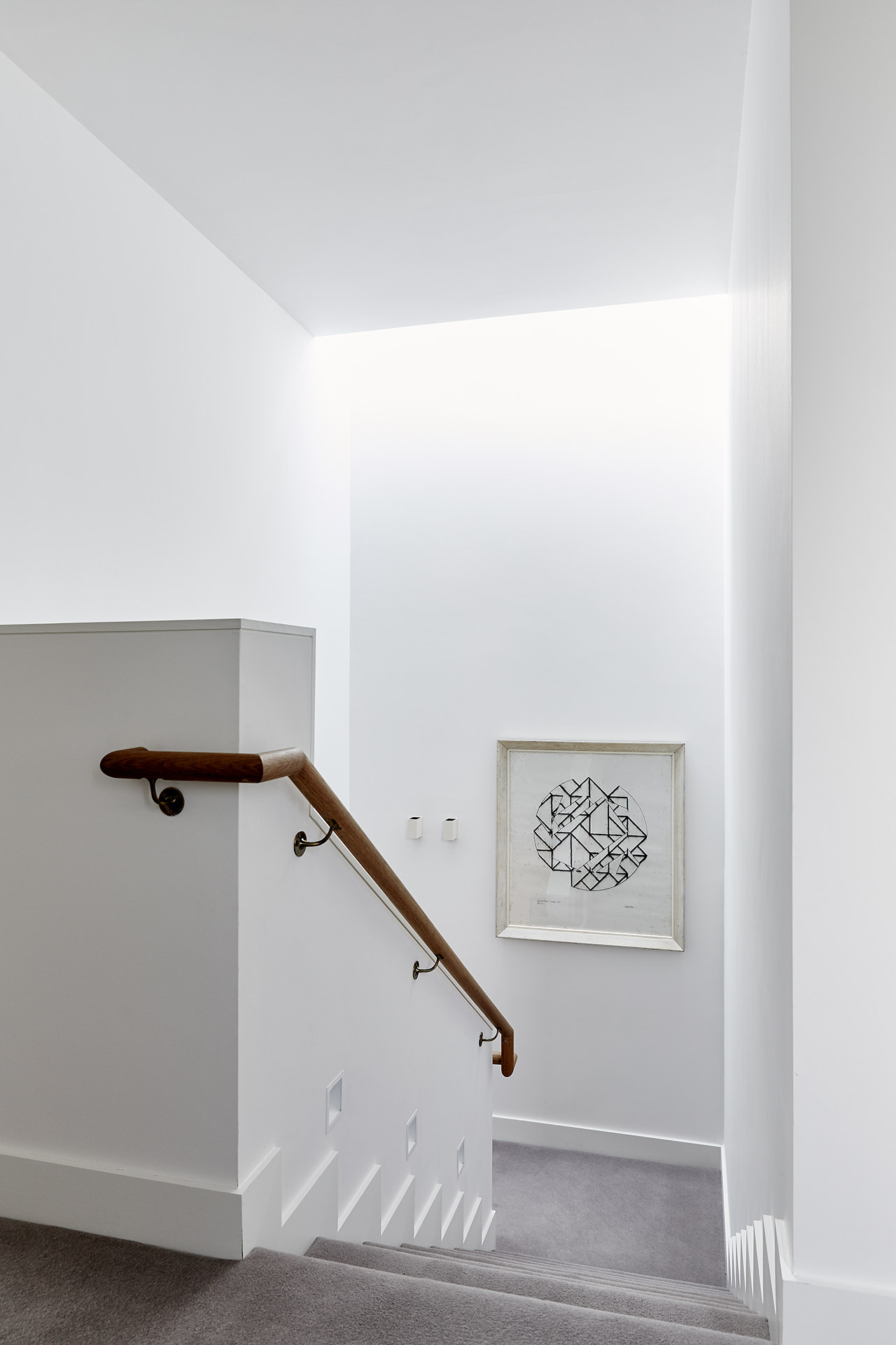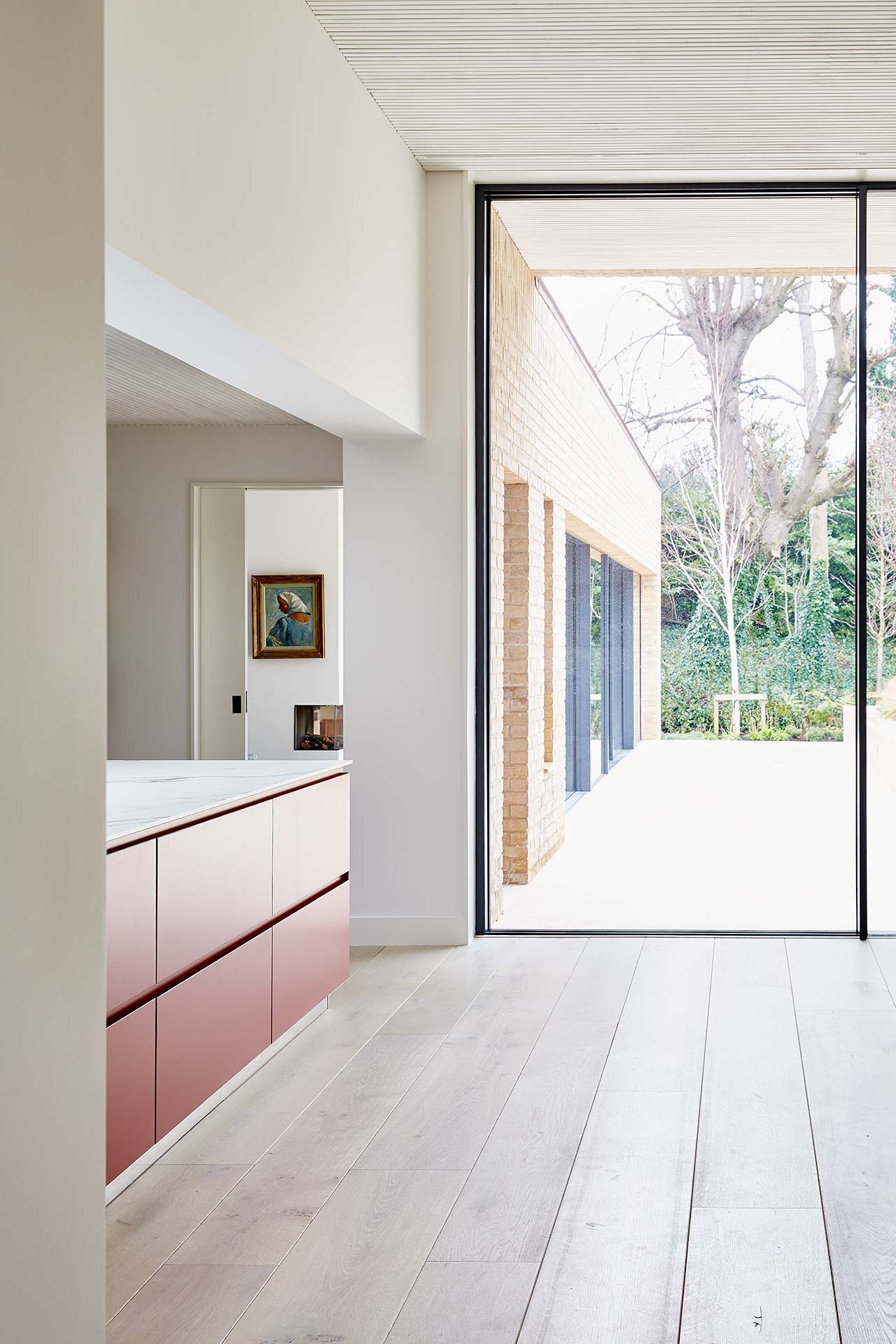 The ceiling heights vary to create grand or intimate rooms. The dining room has 4 metre high ceilings while the bedroom and study room drop to 2.7 metres. Slatted timber ceilings were installed throughout to help soften the acoustics and a single floor finish of smoked oak was used throughout the ground floor.