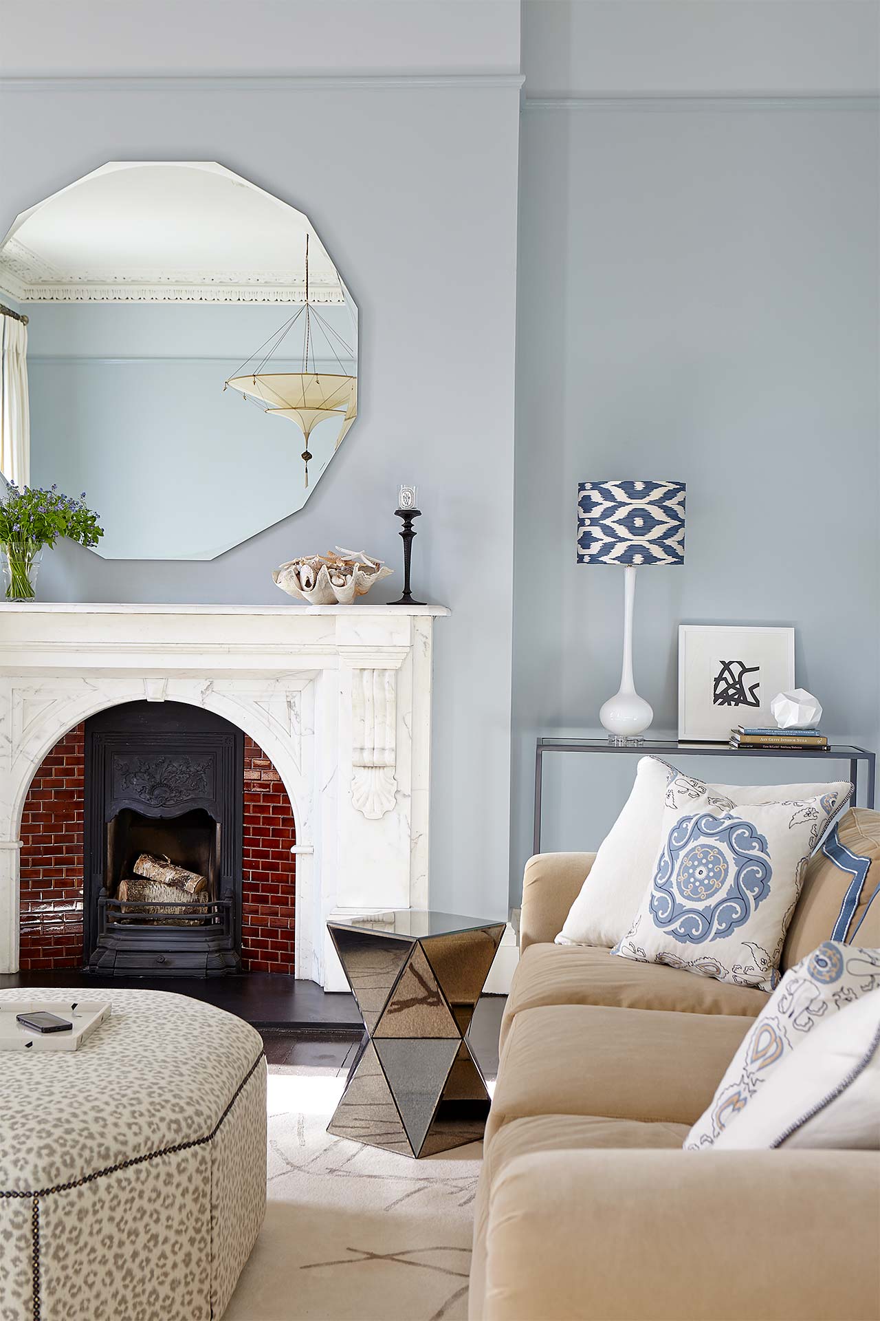 The inspiration for this room was blue and white, combined with a tan colour. There are layers of blue and white prints on the upholstery. We designed the rug with branch motif and an angled mirror over the fireplace. A pendant is by Venetia Studium and fills the space where a chandelier would traditionally hang. It is a large room so we wanted to make it feel full and rich with texture.