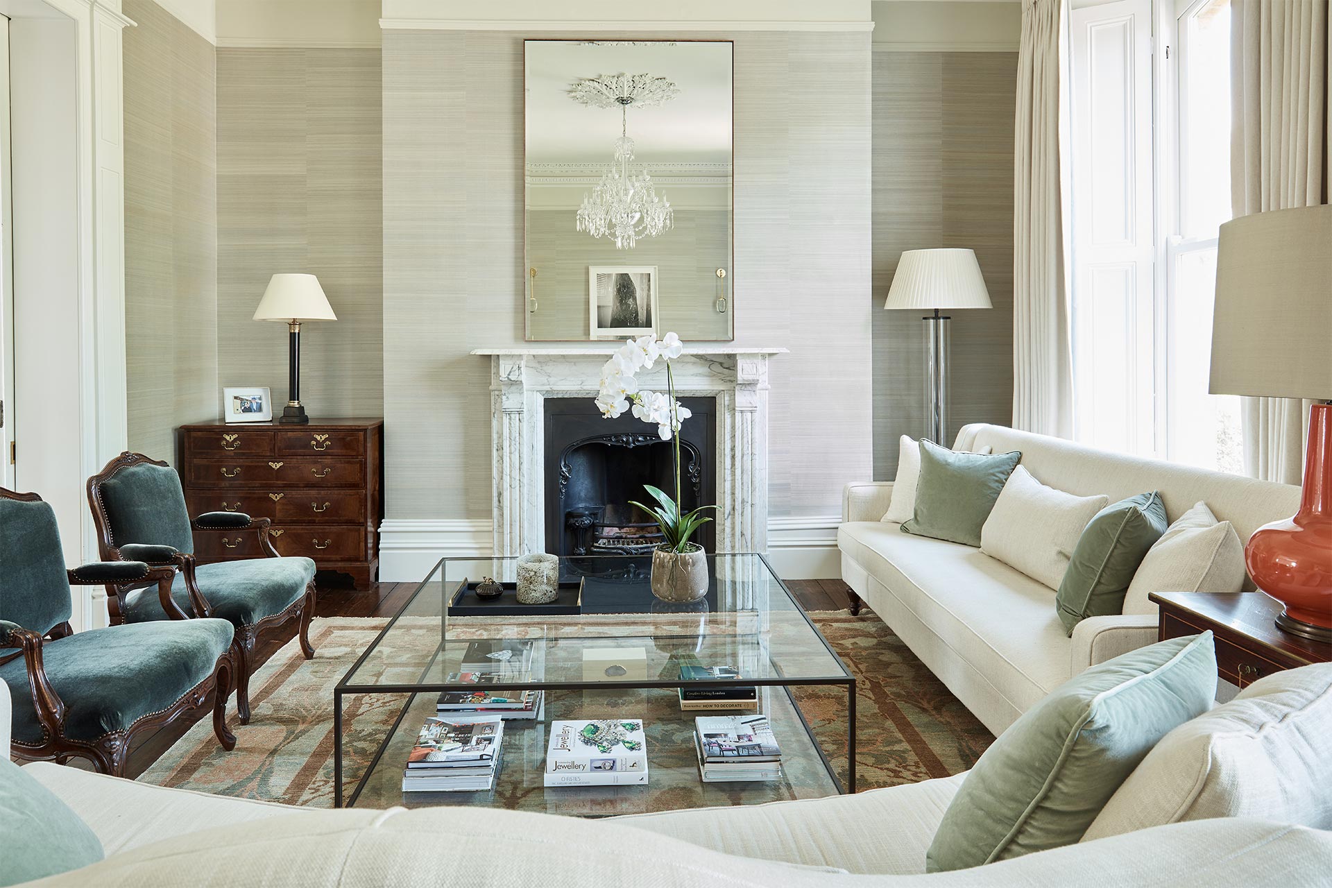 The client wanted this room to be formal but relaxed in atmosphere. We combined antiques with new furniture and contrasting materials such as silk wall-covering with linen curtains. The colour palette came from the Donegal carpet in an Arts & Crafts style. The sofas were custom made in two different linen fabrics.