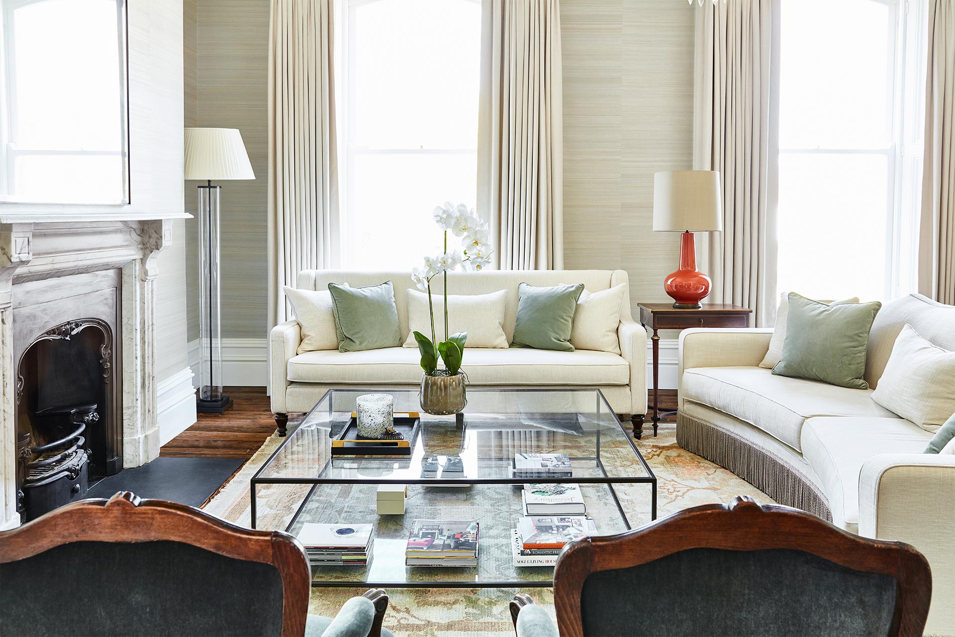 The colour scheme for this drawing room is connected to the rest of the house to create cohesion between spaces that open to one another. The walls are pale mauve-pink and the simple linen curtains are linen to contrast with glamorous materials in the furnishings. The cocktail cabinet is burr walnut with an applied bronze pheasant and was made by Zelouf & Bell. We used a mix of contemporary, antique and vintage to give the room layers of interest.