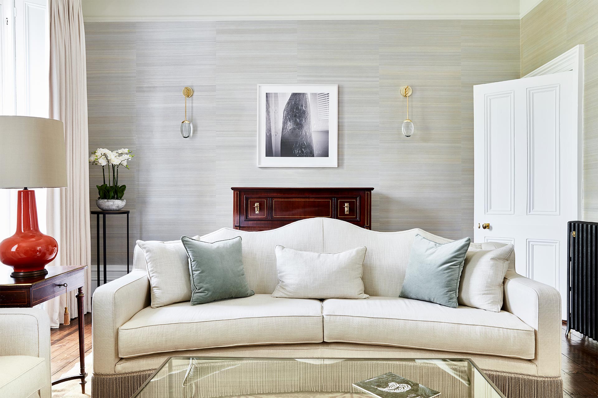 When our clients bought this house it had last been decorated in the 1940s. We updated the colour scheme of grey and pink and added secondary colours inspired by the artworks. The wallpaper was made by David Skinner. The aim was to keep the room classical in tone but include contemporary elements. We restored the original wall lights.