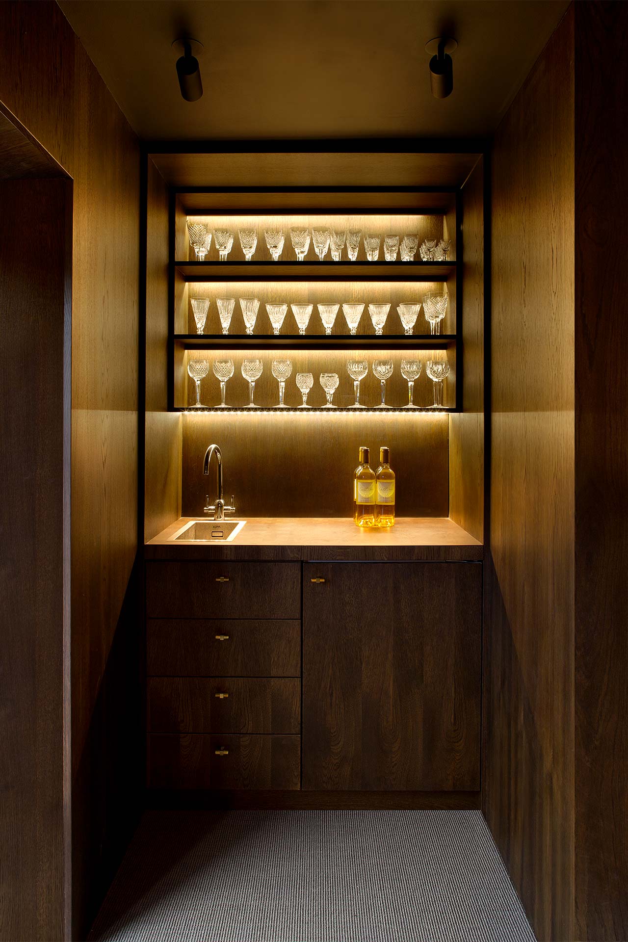 This bar area was built in a space that had been created by a previous renovation of the Victorian house, due to the installation of a bathroom at a mid floor level. In the main room, we created a library by adding bookcases topped with mirrored arches. The centre section has double glass doors to a small bar. The bar is contemporary in style and lined with timber panelling. It has a counter made of wood blocks, back-lit shelves and a small basin. The bar also acts as a serving area as it is close to the dining room on the main floor of the house.