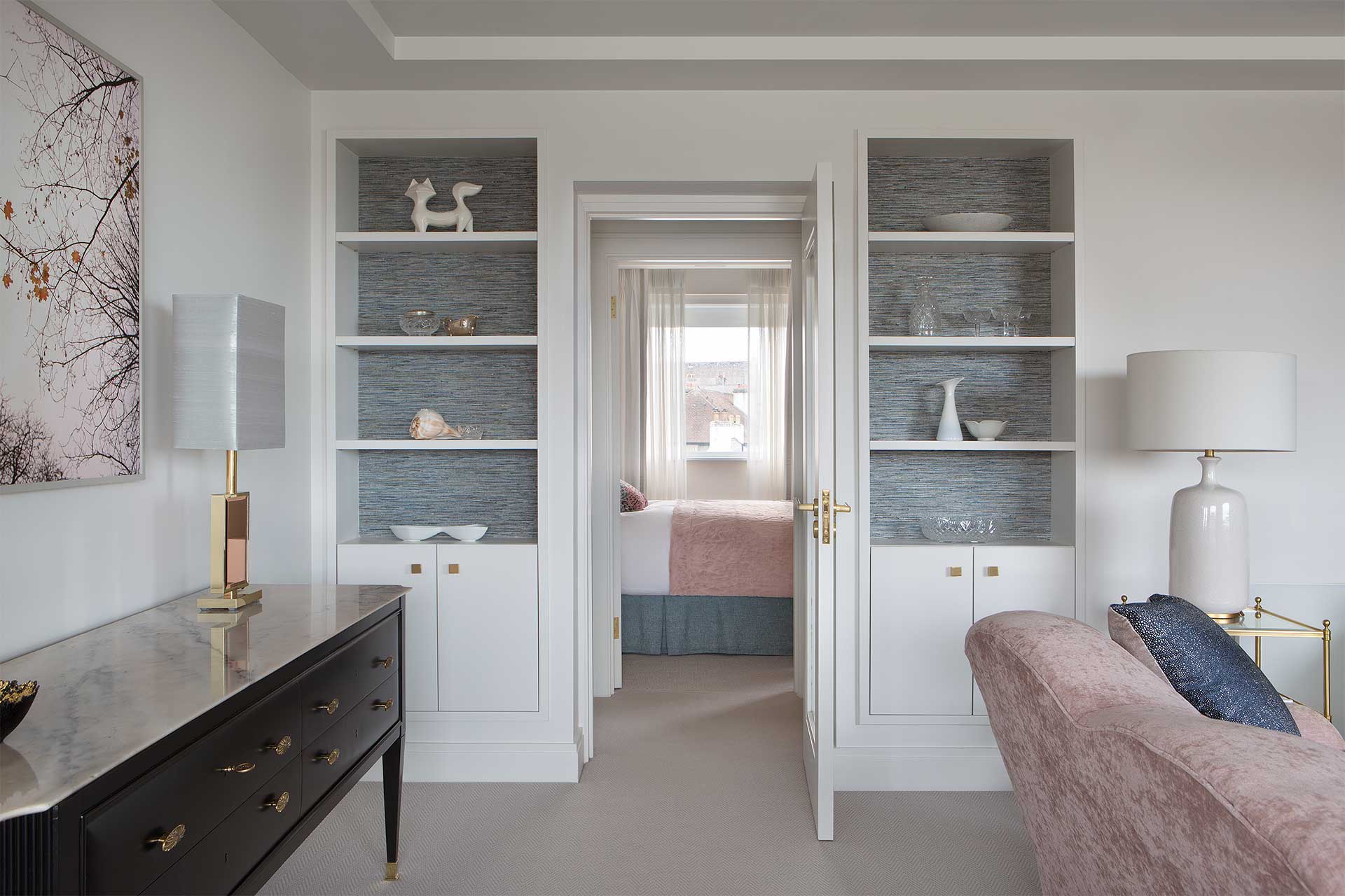 As part of the renovation of a 1980s apartment we built out one of the living room walls to create bookcases and added a bulkhead to define the ceiling. The back of the bookcases was wallpapered to add depth and allow the objects on them to come to the fore. The furnishings are mostly vintage, such as the 1950’s sideboard and lamp, to give the space a sense of permanence.